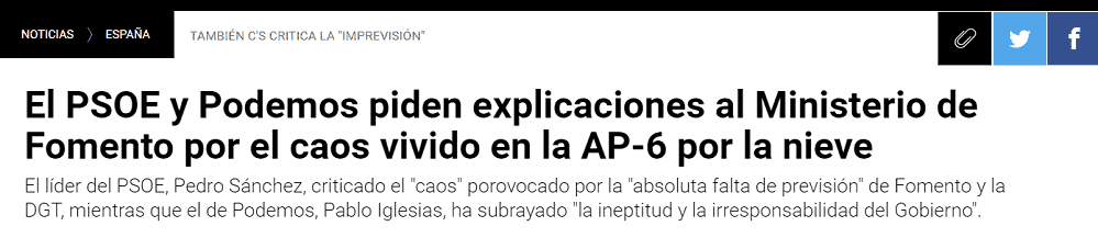 Que a lo mejor la culpa no es del gobierno. O no toda. Pero es que no hace dos meses teníamos a todos los partidos que en Madrid son oposición, pero aquí son gobierno, bramando contra el gobierno central y exigiendo responsabilidades por los problemas en la AP6. O la culpa es del tiempo o la culpa es del gobierno, pero siempre, no según convenga a cada partido.