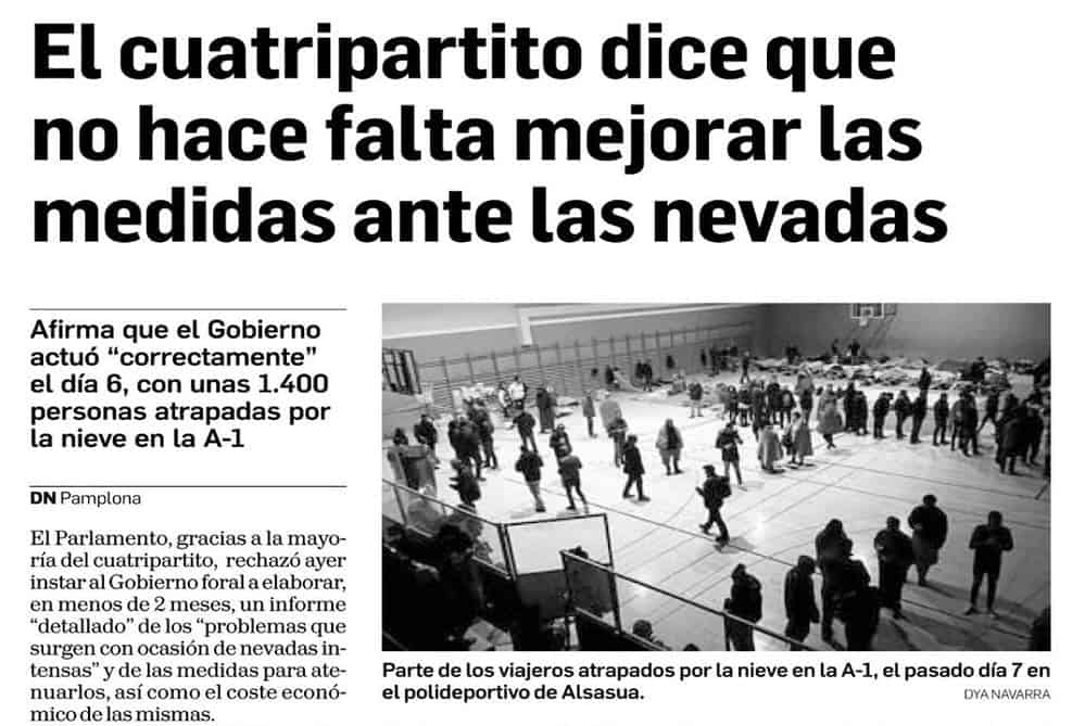 Si retrocedemos dos meses en el tiempo, y al hilo de la situación que se había producido en Alsasua, encontramos también al cuatripartito rechazando en el Parlamento foral tomar ninguna medida para mejorar la coordinación, la información y la organización ante futuras nevadas, porque “el dispositivo de emergencias funcionó de manera ejemplar” y bla, bla, bla. Interesa recordar ese momento no ya porque hable bastante por sí mismo, sino porque ayer el cuatripartito intentaba justificar el caos generalizado en Pamplona y en toda Navarra asegurando que había movilizado el 100% de los recursos disponibles. Pero es que salta a la vista una y otra vez que esos recursos son insuficientes, por lo que eso ya no vale como excusa a la segunda.