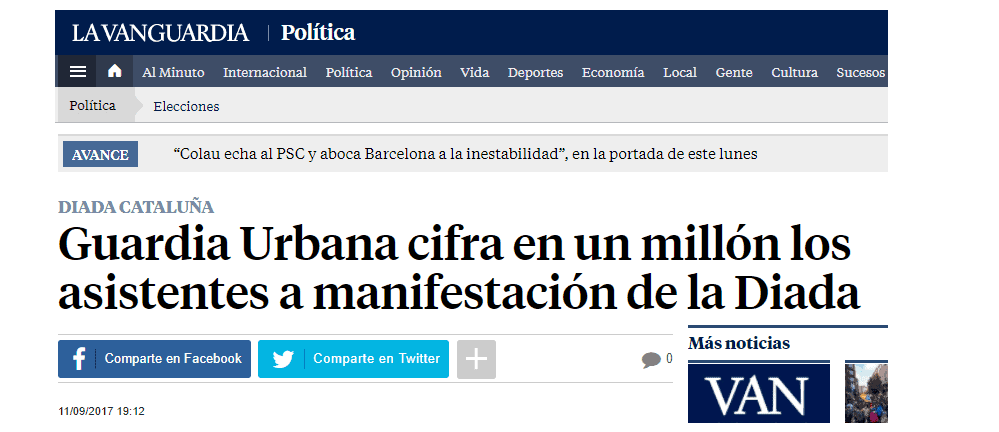 La crisis catalana ha tenido como elemento más importante en los últimos días la manifestación del sábado bajo el lema “Libertad presos políticos. Somos república”. Según la Guardia Urbana de Barcelona asistieron a la concentración 750.000 personas. El momento cumbre de la manifestación, que además nos vendrá bien después, fue aquel en el que los asistentes, tras ponerse el sol, encendieron las linternas de sus móviles para crear esa imagen de luz en la oscuridad, resultona pero en alguna medida inconveniente, pues facilita la labor de contar.