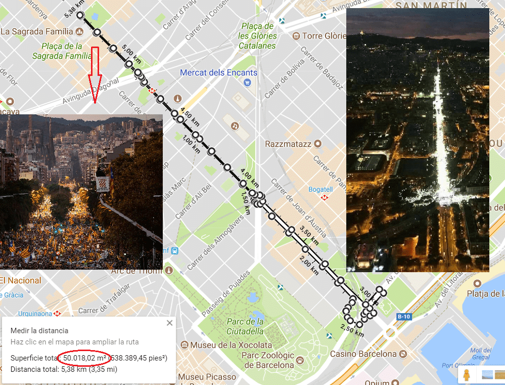 Si nos retrotraemos a la mentada Diada del pasado 11 de septiembre, antes de la DUI, del 155, de la fuga de Puigdemont o del encarcelamiento de “los Jordis” y los exconsejeros, frente al millón de la Guardia Urbana o los 2 millones de otras organizaciones, nosotros medíamos 165.000 metros cuadrados ocupados (50.000 el sábado). Huelga decir que a igual densidad de manifestantes, habría que pensar que tras todos esos acontecimientos se manifestó el sábado menos de la tercera parte de personas que el 11S. Algunas fuentes consideran que había manifestantes hasta la calle Industria, un poco más atrás aún que la Sagrada Familia. Tal cosa no se verifica en las imágenes, pero incluso en ese supuesto apenas se añadirían unos pocos miles más de asistentes correspondientes a 2.500 metros cuadrados.