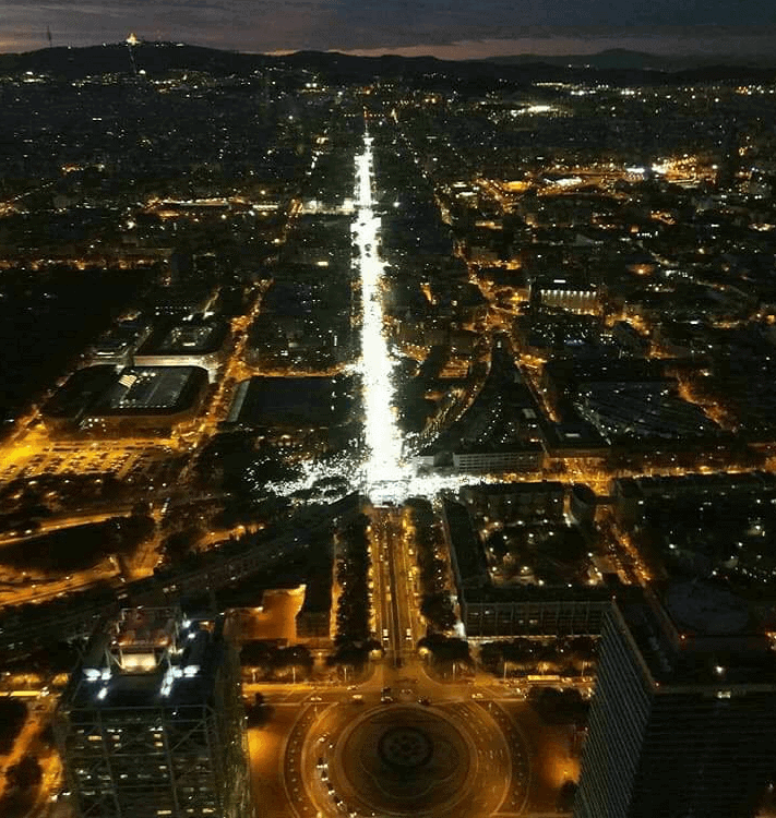 Como pueden apreciar en el mapa y las imágenes, el espacio ocupado por la manifestación resulta fácil de calcular gracias a la idea de utilizar las linternas de los móviles. El espacio ocupado es simplemente el espacio iluminado. El recuento más optimista sería el correspondiente al tramo de Carrer de la Marina entre la Sagrada Familia y la Avenida d´Icaria, unos 50.000 metros cuadrados y por tanto un máximo en torno a 150.000 asistentes, estimando 3 personas por metro cuadrado.