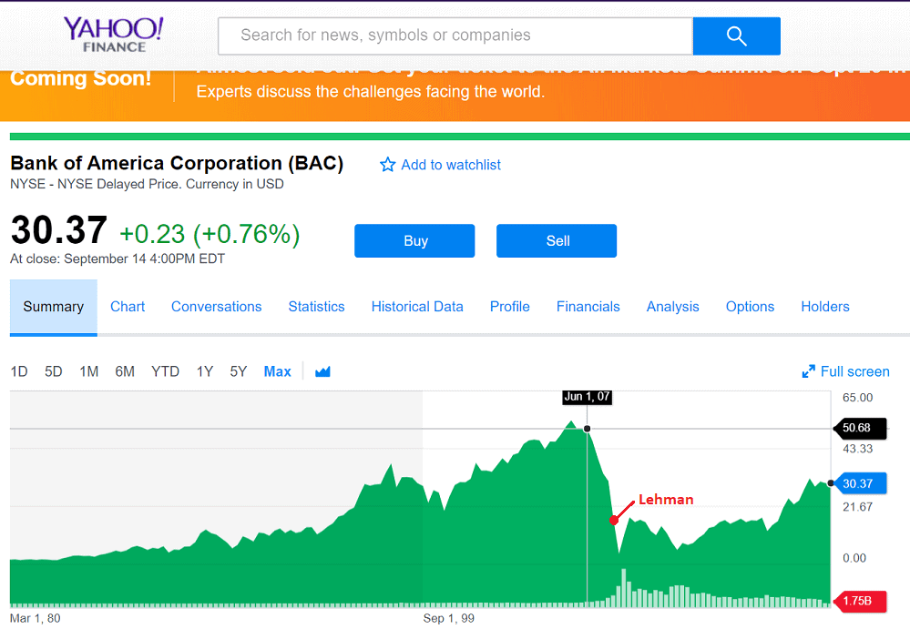 Para empezar, la quiebra de Lehman Brothers no fue la causa de ninguna crisis, sino una de sus consecuencias. Ni siquiera cronológicamente se sostiene ese relato. Lehman quebró en septiembre de 2008. Para aquel momento, los grandes bancos estadounidenses, los de verdad, tanto Bank of America como Citigroup, llevaban un año en bolsa bajando cerca de un 70%. En concreto, las acciones de Bank of America habían bajado de 50 dólares en julio de 2007 a 16 en septiembre de 2008. Todo este desplome tuvo lugar ANTES de la quiebra de Lehman. Los bancos estaban en caída libre desde más de un año antes, con el colapso de dos fondos inmobiliarios de Bear Stearns, es absurdo iniciar la cronología de la crisis con la caída de Lehman.