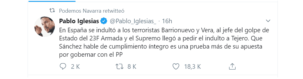 No hay ni un socio de Barcos, tampoco, que no victimice a los autores de una agresión nacionalista en vez de posicionarse junto a las víctimas exiliadas y olvidadas, como con la reciente sentencia de Alsasua. Por no posicionarse contra el golpismo separatista, estamos en un punto en que podemos ver milagros como a Pablo Iglesias defendiendo los indultos del GAL y proponiéndolos como modelo de actuación.