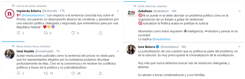 La sentencia del Tribunal Supremo ayer sobre el golpe de estado del nacionalismo catalán sirvió, si no para otra cosa, al menos para evidenciar que todos, absolutamente todos los socios de Chivite en el Gobierno de Navarra, están con los golpistas y frente a la Justicia y el estado de derecho. No hay ni un socio de Chivite que no piense que los separatistas catalanes pueden montar un pucherazo, suspender la legalidad vigente y los derechos del 53% de los catalanes con una minoría del 47%, sacar a la gente a la calle y declarar impunemente una república independiente.
