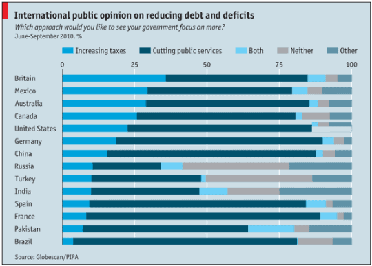 Las cuentas de todos los estados se encuentran bañadas en los números rojos. En este momento, por tanto, todos los gobiernos experimentan la urgencia de reducir sus abultados déficit públicos, naturalmente unos más abultados que otros. Entre las medias a adoptar para cuadrar las cuentas, las opciones más evidentes son las de recortar el gasto público, subir los impuestos o ambas. The Economist ha elaborado una macroencuesta entre 22.000 personas de 22 países, para comprobar cuáles son las preferencias al respecto de los ciudadanos. Entre los resultados de la encuesta destaca la opinión de los españoles, siendo España uno de los países más afectados por la crisis y la tormenta crediticia. Llama la atención que la mayoría de los españoles encuestados, entre subir impuestos y recortar gasto, elige de forma abrumadora la opción de no subir impuestos y recortar los gastos. Tal vez porque los españoles estamos padeciendo con especial crudeza las desastrosas consecuencias de la política socialista, justo orientada en sentido contrario.