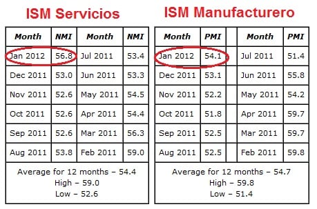 Todo lo anterior, como los sucesivos records de empleo que va batiendo Alemania, nos ayudan a distinguir dos escenarios, ambos malos, pero uno bastante menos malo que el otro: el escenario en el que España es un país más en el torbellino depresivo y el escenario en el que España se ha descolgado por sus propios pecados de la recuperación del resto del mundo. Este escenario, con todo, resulta mucho mejor que el otro. Algunos datos se empeñan en seguir siendo buenos Para España sería un grave problema que del escenario de recuperación global se pasara a otro de recesión global en la situación en la que nos encontramos. Obviamente no se puede descartar ese escenario en el futuro. Por otro lado, la recuperación global tampoco está siendo particularmente intensa. Finalmente, la recuperación no durará eternamente. Sin embargo, hay un dato que sigue manteniéndose firme frente al pesimismo generalizado y es el crecimiento de la econonía norteamericana. Un crecimiento que nos permite seguir pensando que el mundo se sigue recuperando y que los españoles estamos aún en el escenario menos malo, un escenario en el que podemos aspirar a recuperarnos. Los datos del Indice ISM que a continuación reproducimos muestran cómo la economía USA, hasta el mismísimo mes de enero, ha seguido creciendo e incluso acelerando su crecimiento. Las lecturas en este índice por encima de 50, en sus dos variantes (manufacturera y servicios) significan crecimiento económico.