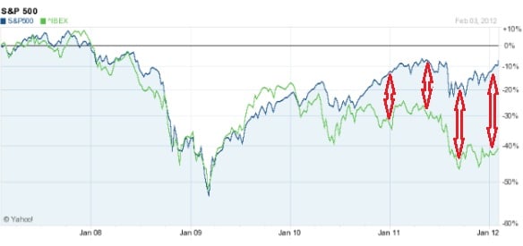 A estas alturas no es ningún secreto cómo llevan a cabo sus proyecciones los expertos en economía. Sencillamente toman una gráfica con los datos de los últimos meses y proyectan hacia delante los datos con una regla. Si la gráfica es ascendente la proyección será ascendente y lo contrario si sucede a la inversa. La experiencia, sin embargo, nos aporta dos datos, de los cuales el primero resulta incuestionable y el segundo casi: que la economía no crece para siempre ni nunca se contrae eternamente y que los economistas raramente perciben el momento en el que cambia la tendencia. Así, por ejemplo, el FMI nos ha amargado el año pronosticando dos años de recesión para España: -1,7% para 2012 y -0,3 para 2013. Todo ello, naturalmente, mandando a la papelera de reciclaje sus propias previsiones inmediatamente anteriores. Aunque hasta un reloj roto da la hora exacta dos veces al día, entre los economistas más escépticos se duda que el FMI sepa siquiera lo que la economía hará la próxima semana. Y algunos datos apuntan en ese sentido. El mundo sigue en fase de recuperación Cuando España se encontraba en recesión hace tres años, interesaba recordar que también el resto del mundo se encontraba en recesión. Sin embargo, cuando España seguía en fase de recesión-estancamiento mientras el resto del mundo iniciaba la senda de la recuperación, dejó de interesar hablar de lo que pasaba en el resto del mundo. La siguiente gráfica muestra la evolución del índice más importante de los EEUU, el Standard & Poor´s 500, comparado con el IBEX 35. Fácilmente se pueden apreciar tres diferencias: