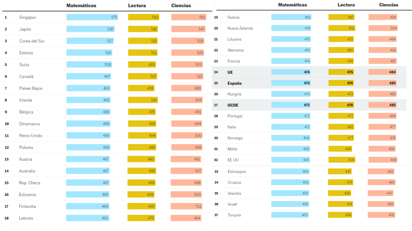 En primer lugar, comentaremos de forma rápida los resultados del informe PISA de 2022, el cual pone en evidencia las carencias educativas de nuestro país, ya que presenta un resultado inferior al de nuestros vecinos europeos en todas las materias evaluadas, además de suponer un mínimo en la serie histórica de resultados obtenidos por nuestro país desde el año 2000, fecha en la que inició a realizar este informe, lo que indica la tendencia negativa que presenta nuestro país a nivel educativo.